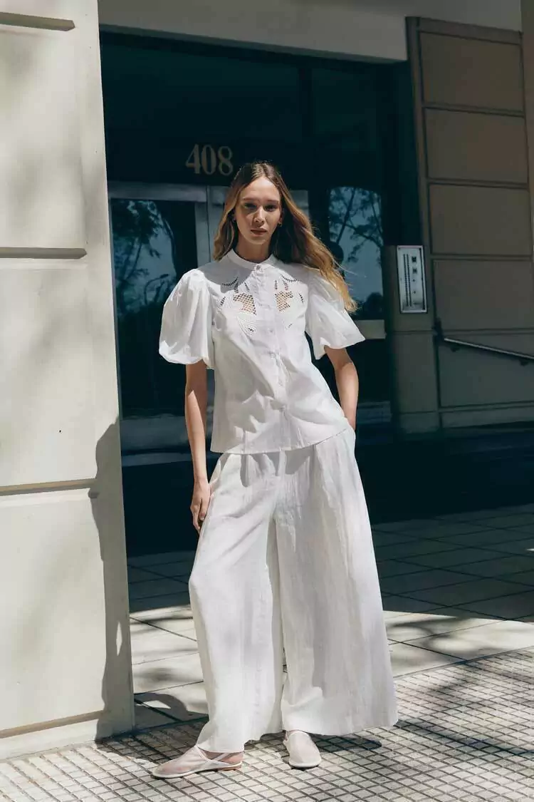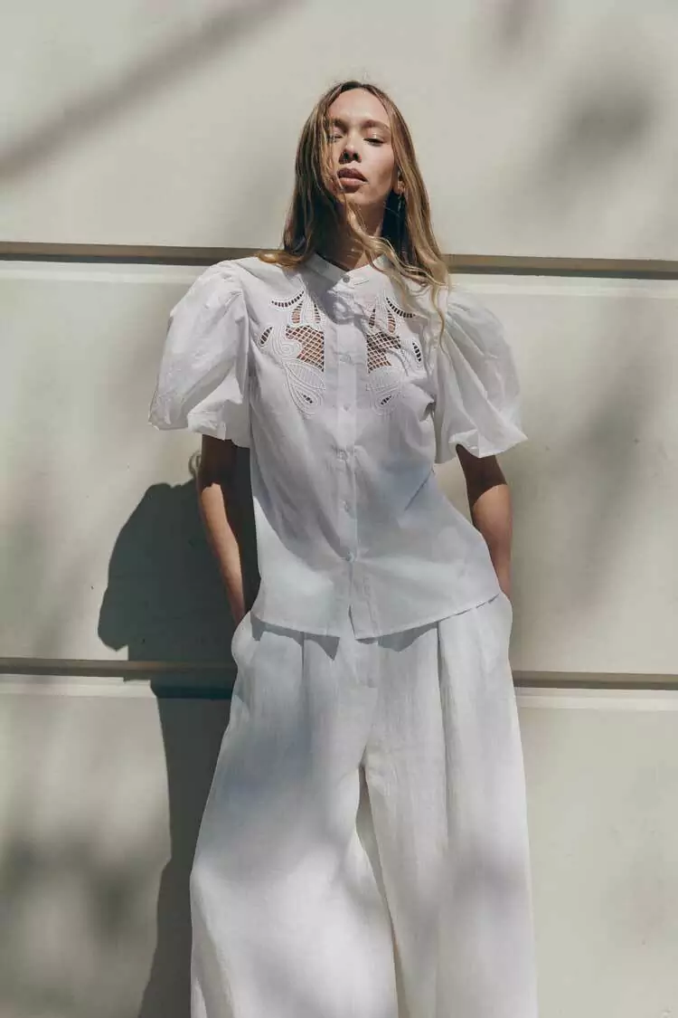 Su diseño se destaca por un detalle de bordado al tono en el frente, que añade un toque sutil y elegante. Las mangas globo con puño elástico no solo son modernas, sino que también aportan un aire romántico a tu outfit. Además, el cierre frontal con botones forrados garantiza un acabado impecable y refinado.