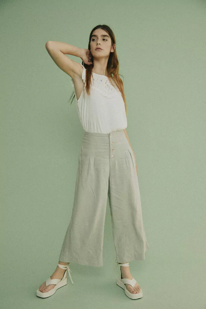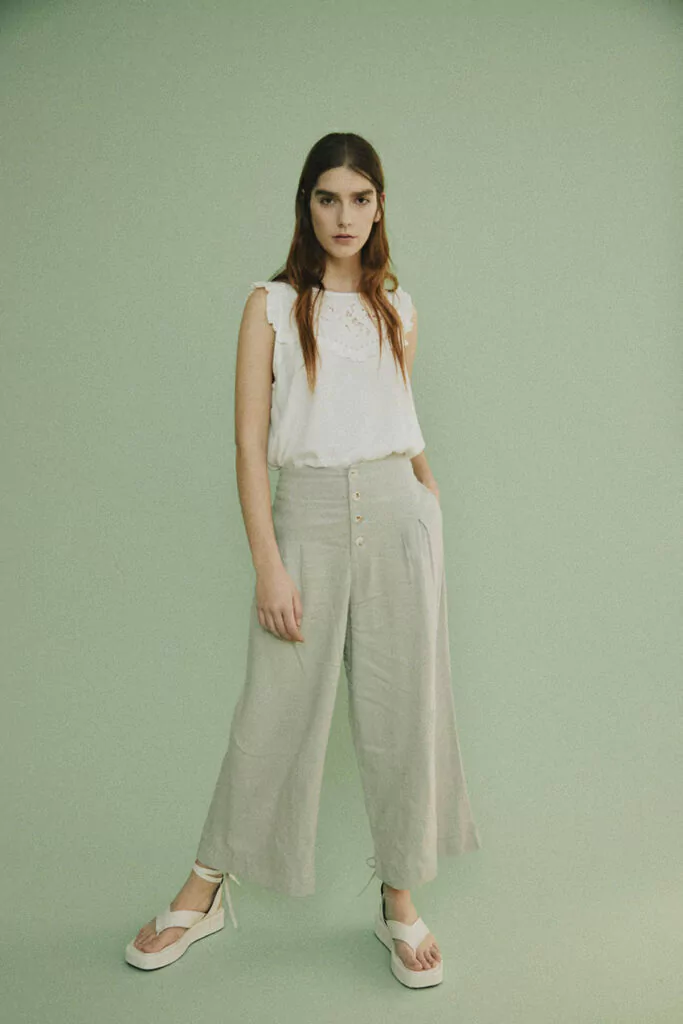 Descubre la elegancia y el confort del Pantalón Marsella, una prenda imprescindible en tu guardarropa. Este precioso pantalón palazo de lino combina un diseño sofisticado con detalles únicos que realzan cualquier atuendo.