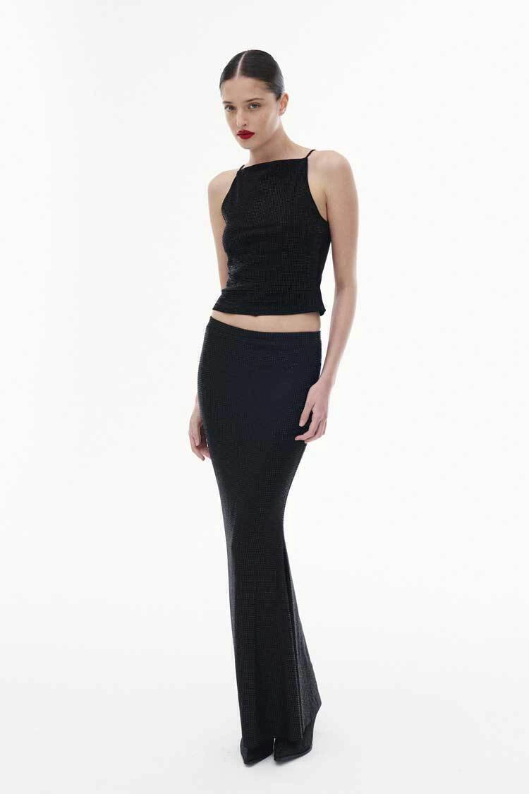Impactá con un look escultural y lleno de brillo con nuestra Pollera Corte Sirena N029, la prenda perfecta que combina una silueta sofisticada con un acabado glamuroso.