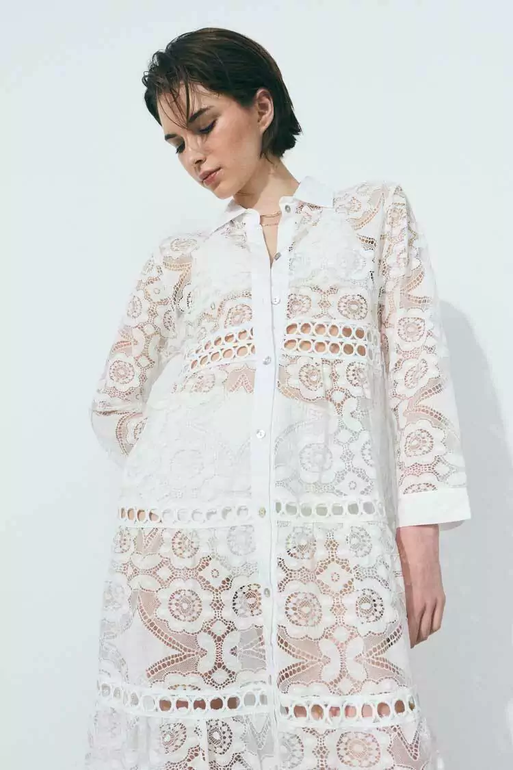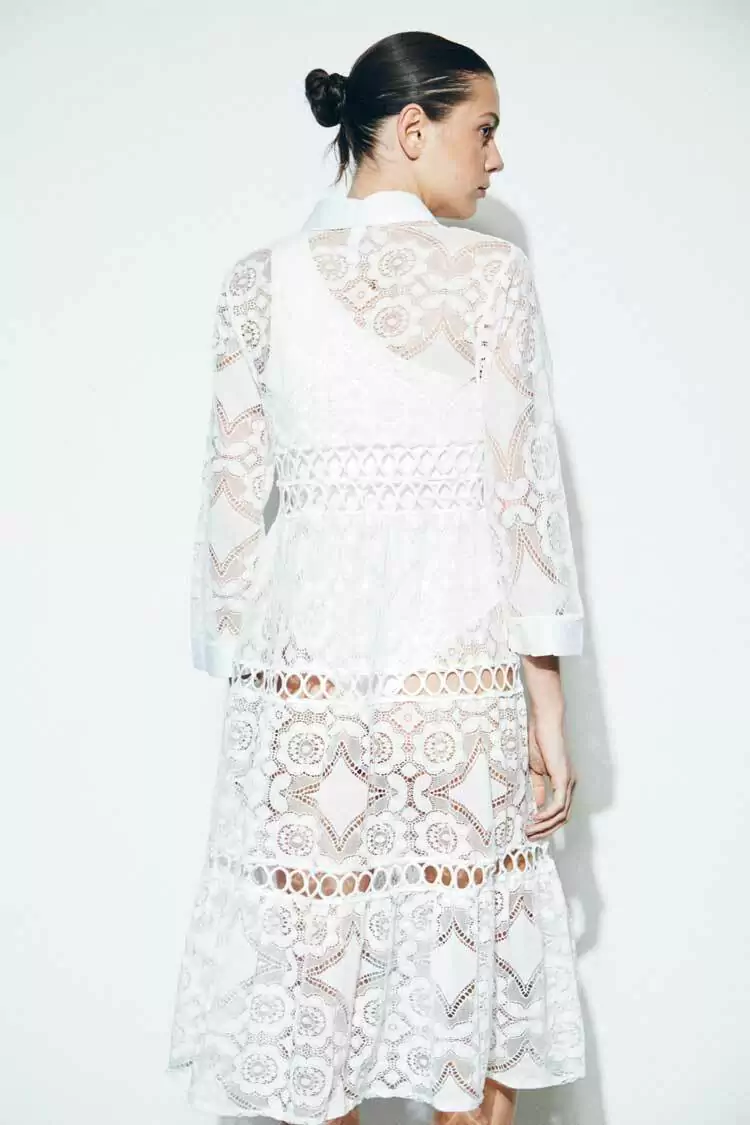 Descubre la elegancia y el confort del Vestido Camisero Lara, una prenda imprescindible para cualquier ocasión. Este vestido de encaje, confeccionado con un 65% de nailon y un 35% de spandex, ofrece una combinación perfecta de estilo y comodidad.